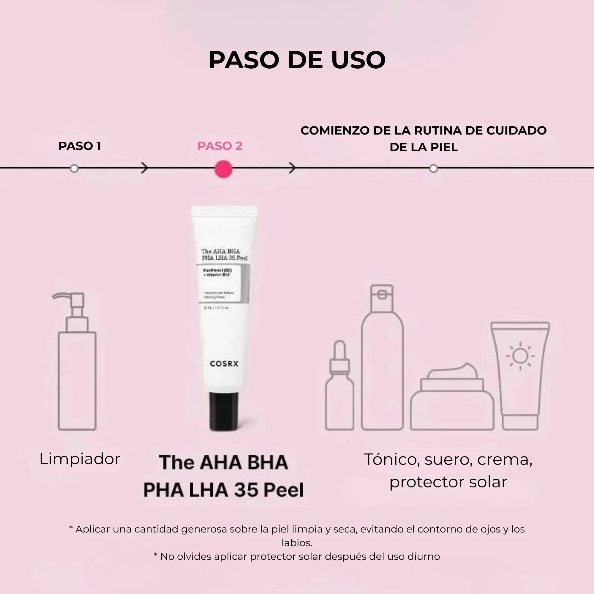 • Evitar combinar el mismo día con otros exfoliantes, retinol o vitamina C pura.
