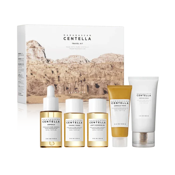 Un completo set de rutina de cuidado de la piel con Centella con 5 productos en tamaño mini para viajar o probar la línea Centella.