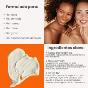 Agua, triglicérido caprílico/cáprico, gliceret-26, metoxicinamato de etilhexilo, salicilato de etilhexilo, dimeticona, bis-etilhexiloxifenol metoxifenil triazina, dióxido de titanio, polisorbato 60, niacinamida, ácido tranexámico, estearato de glicerilo, estearato de PEG-100, dipropilenglicol, copolímero de acrilato de hidroxietilo/acriloildimetil taurato de sodio, hidroxiacetofenona, alcoholes C12-16, sesquioleato de sorbitán, ciclopentasiloxano, hidróxido de aluminio, caprilil glicol, poliacrilato de sodio, lecitina hidrogenada, estearato de etilhexilo, ácido esteárico, ácido palmítico, dimeticona de hidrógeno, goma xantana, polímero cruzado de dimeticona/vinil dimeticona, sorbitán Isoestearato, Trideceth-6, EDTA disódico, glicirrizato dipotásico, fragancia